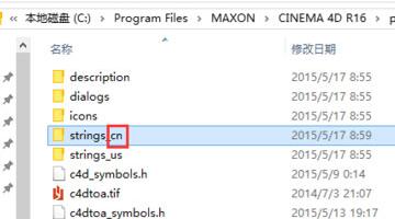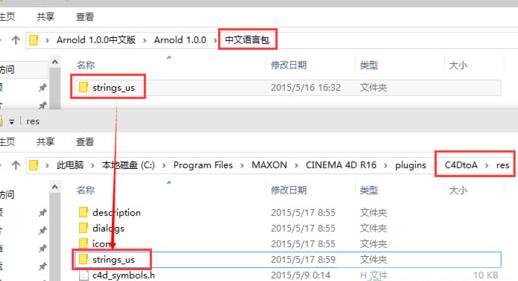 7、找到c4d插件目录下的C4DtoA文件夹下的res文件夹,把安装包里的strings_us文件夹复制并替换掉插件目录里的同名文件夹。也可以把安装包里的语言包改名为"strings_cn"直接放入res文件夹。完成汉化!