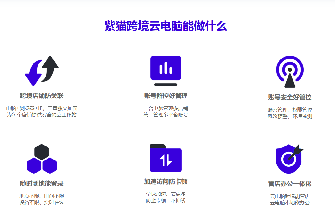 电脑+浏览器+IP,三重独立加固;为每个店铺提供安全独立工作站,拥有独立的云电脑,独立的浏览器,独立的固定IP,紫猫跨境云电脑三重独立店铺更安全!真实独立,不虚拟!比浏览器虚拟独立更安全,比浏览器指纹保护更安全!