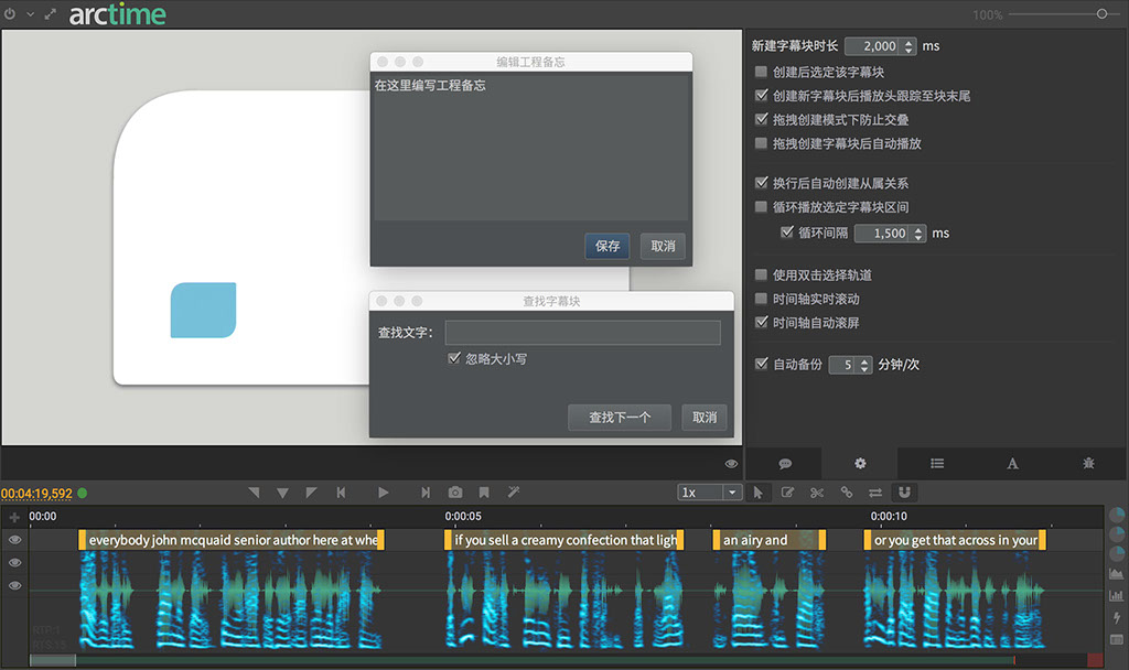 ArcTime独创的字幕块概念,在时间线上拖动、调整字幕块就可以让你轻松完成字幕创建工作。支持读写SRT、ASS格式字幕文件以及可以导入纯文本文件,在音频频谱轨道上拖动即可实现字幕的创建,如果时间轴不对应,还可以自由调整字幕块。