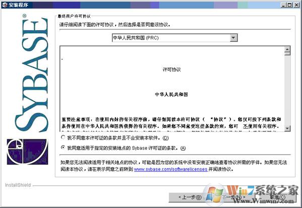 4、选择“中华人民共和国(prc)”,这里如果你英文好,你也可以选择安装英文版的,在选择“我同意适用于指定的安装地点的Sybase许可证条款”,然后在点击“下一步”进行安装,如图: