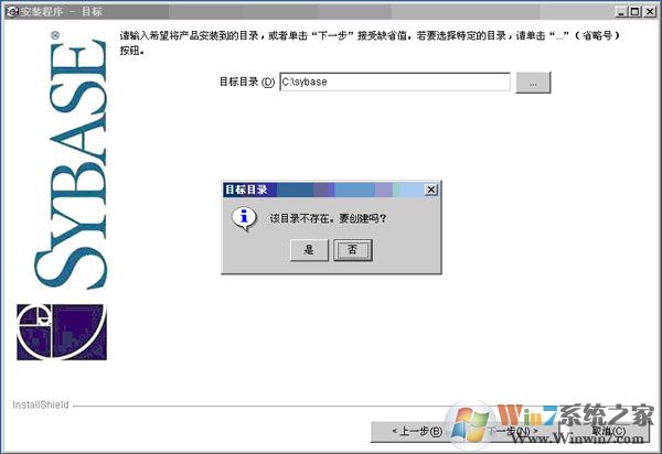 6、点击“下一步”安装的时候提示不存在该目录,问是否要创建“sybase”安装目录。你只点击“是”,就可以自动创建“sybase”目录,如图: