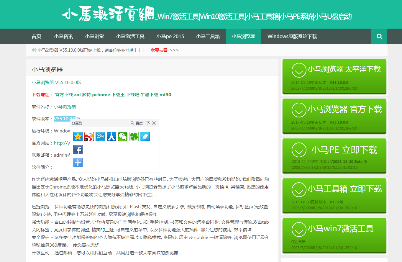 作为系统激活明星产品, 众人期盼小马能推出电脑版浏览器已有些时日. 为了答谢广大用户的厚爱和殷切期盼, 我们隆重向您推出基于Chrome原版本地优化的小马浏览器beta版. 小马浏览器秉承了小马追求卓越品质的一贯精神, 其精简, 迅捷的使用体验和人性化设计的各个功能将会让您充分享受精彩的网络生活
