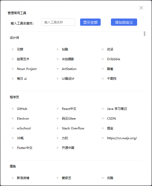为了方便用户的日常使用,已经整合了多个便捷查询工具。支持常用工具的搜索和管理,还有按照分组、名称、网站链接和纯色图标进行自定义。