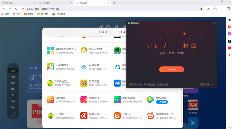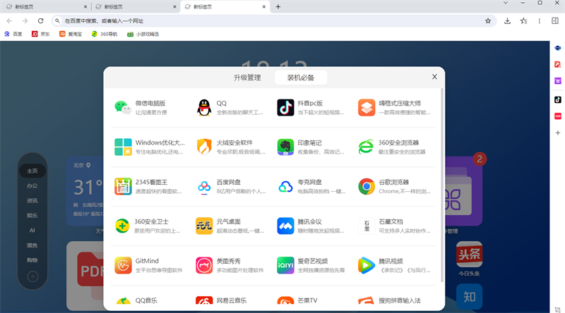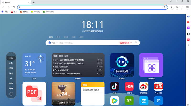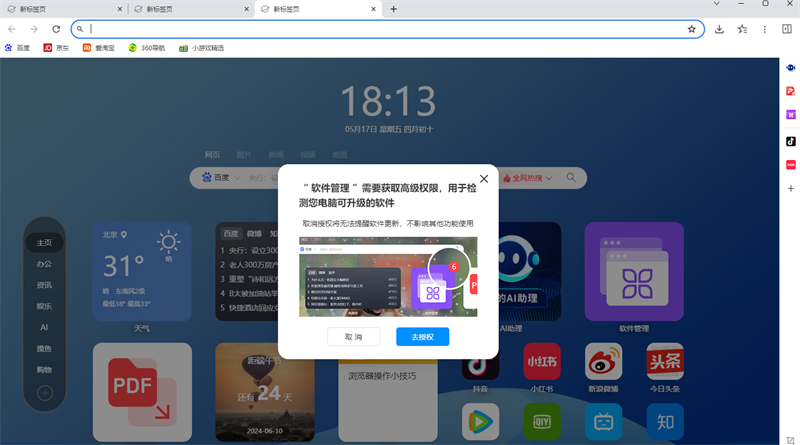 新标签页提供天气、PDF转换、AI助理、软件管理、热搜榜等多种小组件和网站导航