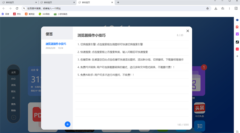 AI桌面浏览器是一款功能十分强大的软件,能为用户提供各种特色功能,例如:天气、PDF转换、AI助理、软件管理和热搜榜等多种生活小组件和网站导航,是一款非常实用的软件,除此之外,AI桌面浏览器还能为用户提供切换搜索引擎、快速搜索、免费PDF转换、免费AI助手、软件管理、热搜榜等特色功能,AI桌面浏览器还有超多的软件优势和产品特点等您下载后使用与感受!
