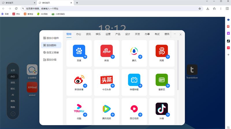 侧边栏:用户可以添加自己喜欢的网站,同时打开两个窗口,边办公边娱乐,工作生活两不误!!