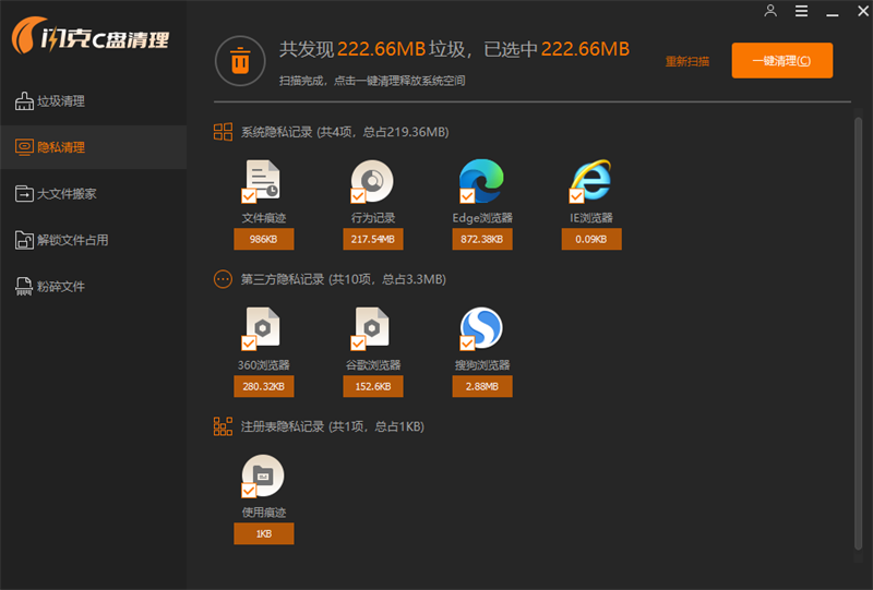 支持清理浏览器历史记录、缓存文件、Cookie等隐私信息,有效保护用户的个人隐私安全