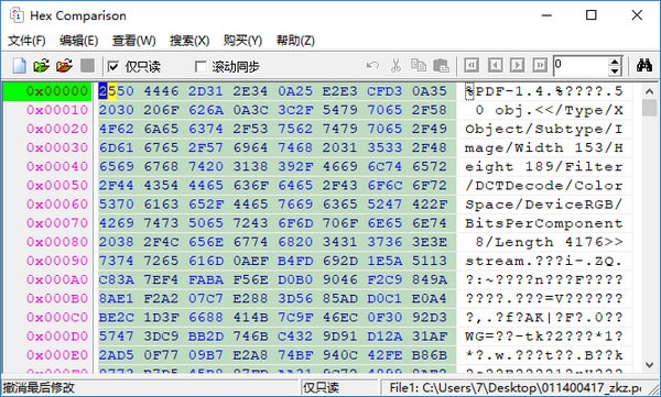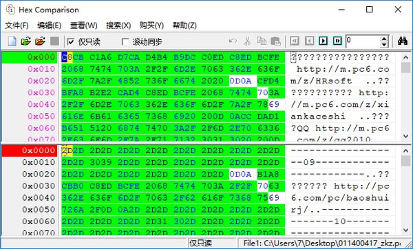 HexComparison能够另外开启2个文件在同一界面较为,它能够全自动较为2个文件的不同之处并高亮显示,并能够把不同之处形成文件储存成文本文档。