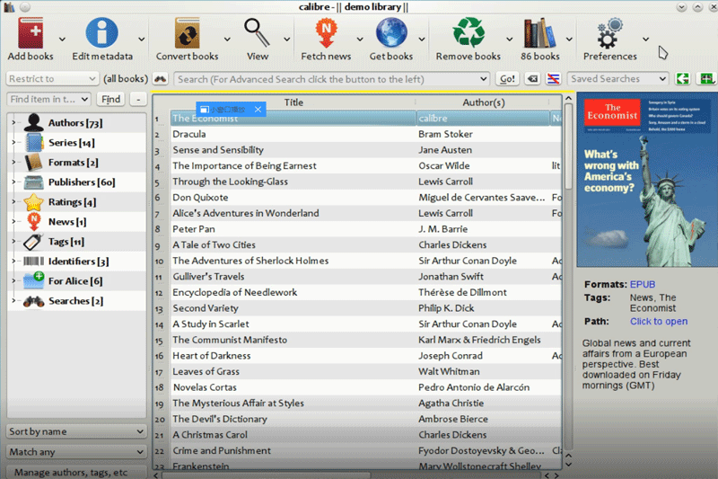 Calibre 犹如一个电子书的图书馆,它支持大多数格式的电子书文件,只要用鼠标将文件轻轻一拽,即可把电子书添加到 Calibre 中来。