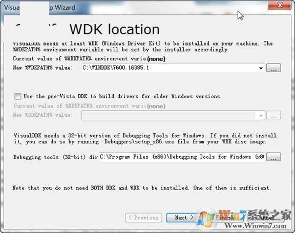 装完(很快)之后,会出现一个配置向导。如果你按照上面的步骤安装,那么WDK位置和DDK位置会自动识别,直接点下一步。