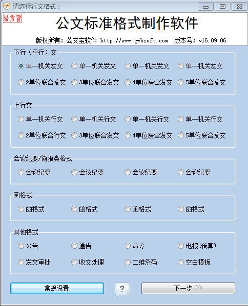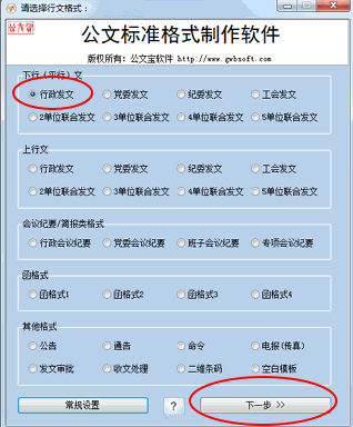 一、在程序的主界面,请选择相应的行文格式,然后点击[下一步]按钮。