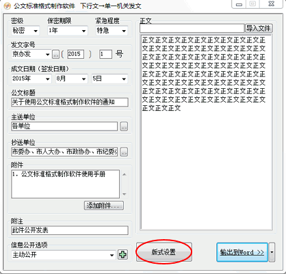 点击“版式设置”按钮,可单独对各文种格式的红色版头、落款单位等公文版式进行设置,如下图。