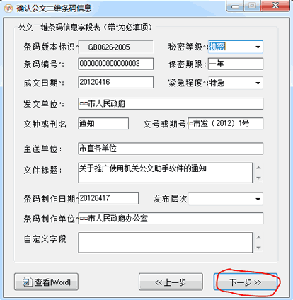 在确认公文二维条码界面,程序将自动调用上一步所包含的信息,请按单位实际情况作补充、调整。各字段填写说明如下:
