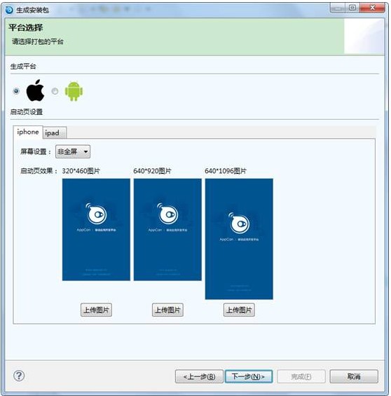 3)选择要生成的平台,启动画面点击下一步