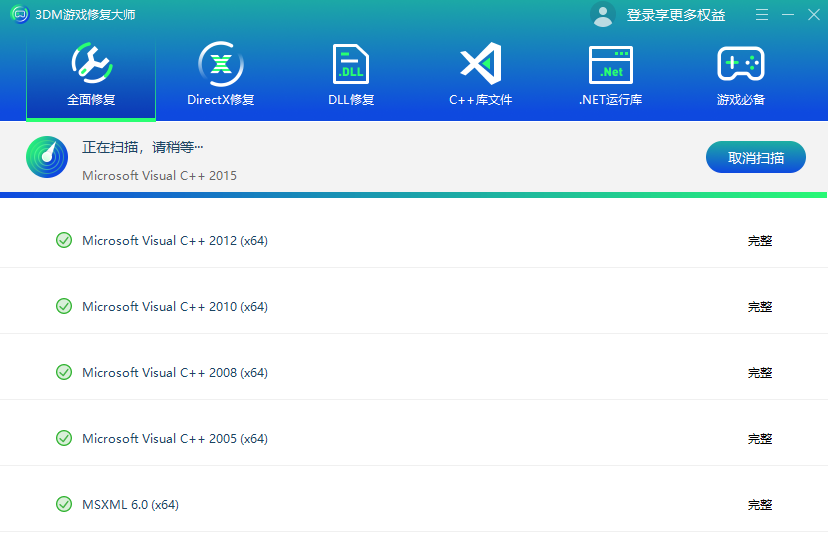 3DM游戏修复大师专业版是一款非常受游戏玩家青睐的游戏工具,该软件的功能丰富且十分强大,能为用户提供各种专业的游戏修复工具和功能,能进行专业的DirectX修复、Net组件修复、VC运行库修复以及VCRUNTIME**.DLL修复、MSVCP**.DLL 修复等等,可以满足用户多样化的使用诉求,除此之外,3DM游戏修复大师专业版还有很多软件优势和特色功能等您下载体验!