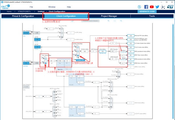 时钟配置采用图形配置,直观简单。各个外设时钟一目了然。STM32F429最高时钟为180M,此处只有在HCLK处输入72,软件即可自动配置。(RCC选择外部高速时钟)。
