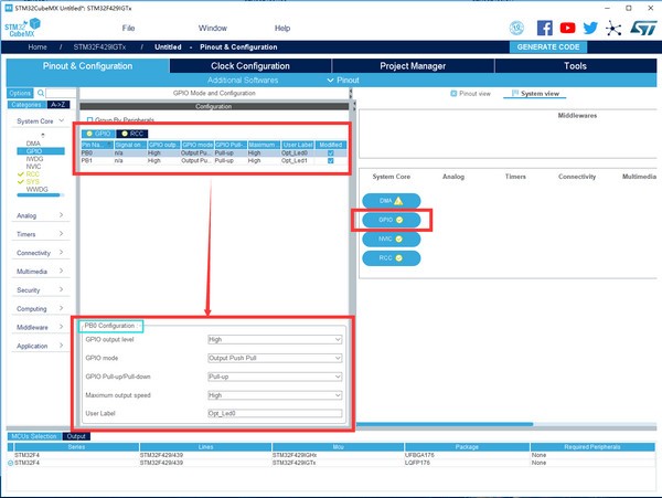 GPIO口功能选择,PB0,PB1为LED1-LED2.找到对应管脚设置为GPIO_Output模式。就会从灰色状态变为激活的绿色状态(黄色引脚为该功能的GPIO已被用作其他功能,可以忽略。绿色表示管脚已使用)