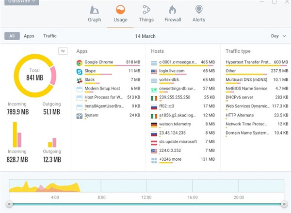 GlassWire能够根据流量类型、应用、图形地址等来形象化你当前和过去的网络连接活跃状态,以简洁清晰的界面让你能够非常清楚的了解活跃状态。能够支持观看到最多30天之前的活跃信息。