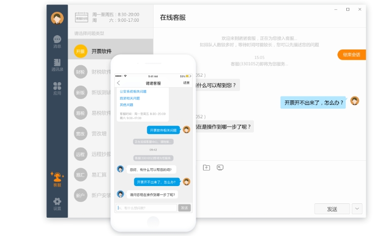 航信开票软件等产品指定的在线客服软件,依托多年财税行业经验,将常见问题合理分类便于用户选择,并通过人工答疑、远程协助等多种沟通方式,快速解决各类问题。