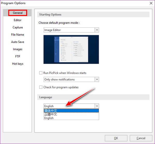 PicPick软件打开后如果默认是英文界面,可以在File→Options→General→Languages处将语言设置为简体中文,如下图所示: