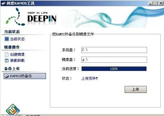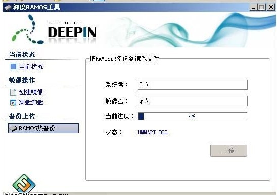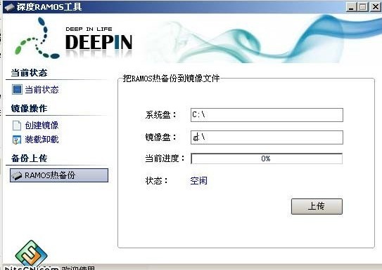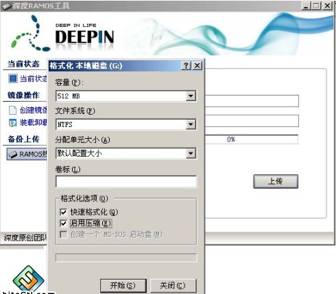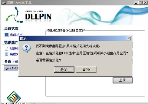 这个时候,如果是新创的盘,还是空白的,需要把本机的操作系统全盘拷到镜像中,才能以镜像来启动;这个过程我们称之为“备份上传”---RAMOS热备份;填写装载的盘符。格式化时,可以选“压缩”