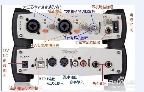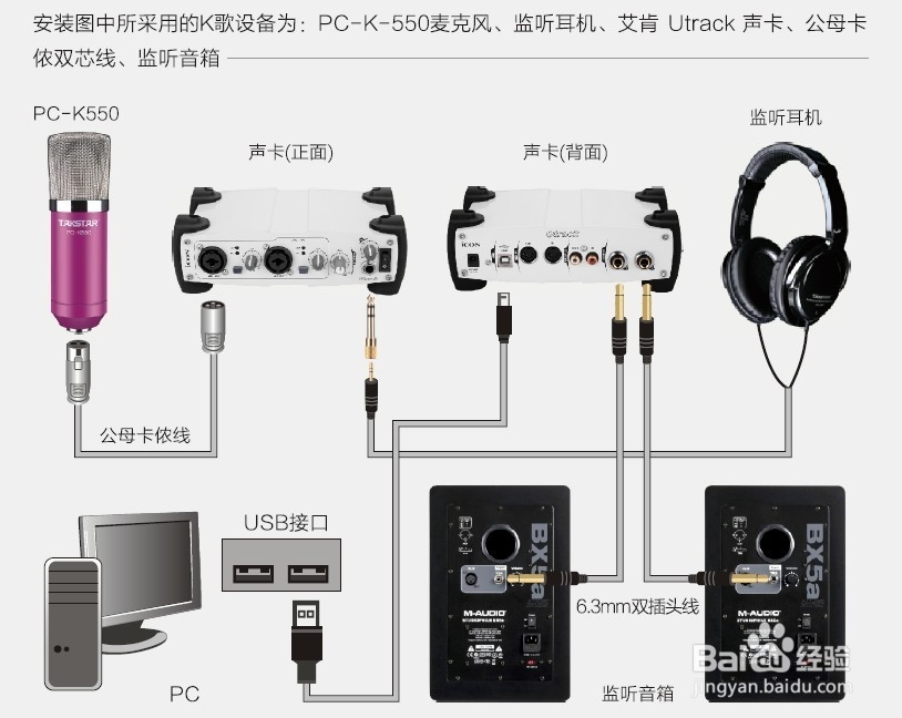 第一步:安装声卡外部线路,声卡如何连接电脑,以及电容麦和耳机的插法。