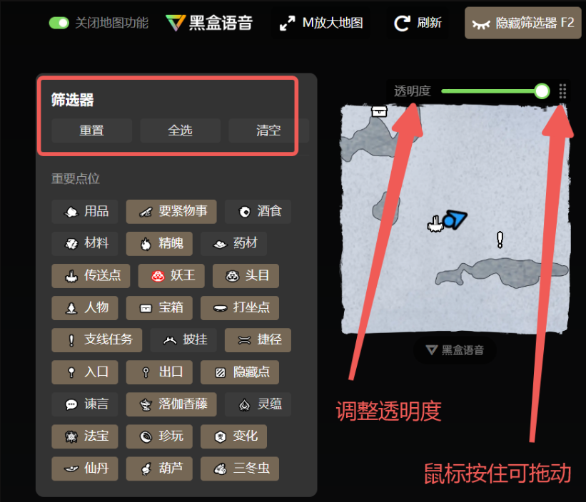 第五步:按下F2键,可打开「点位筛选器」,可选择小地图展示的点位。还可以调整小地图透明度和拖动小地图。