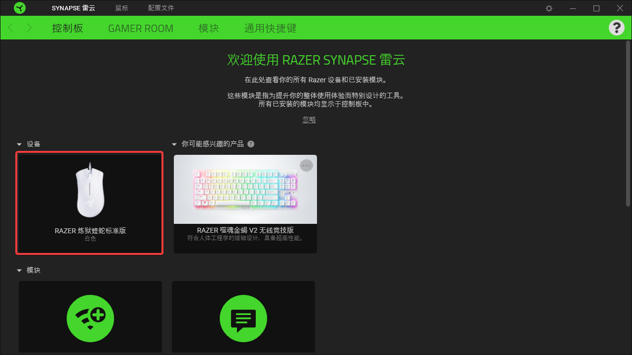 3、在【设备】区域可以看见已经连接电脑的雷蛇鼠标,直接点击进入配置界面