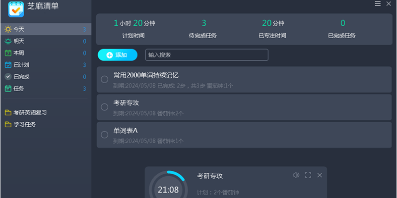基于番茄工作法,让事情更有规律和高效。给任务设定一个时间,专注完成这个任务。