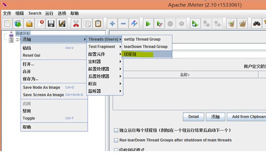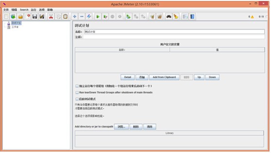 Jmeter运行在目录 \apache-jmeter-2.10\bin下jmeter.dat文件,双击打开进入Jmeter界面