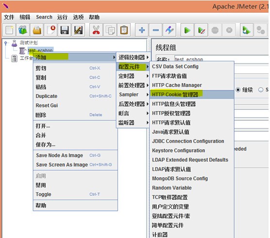 添加一个Cookie管理器,该次测试是需要登陆操作,如果没有Cookie管理器,登陆后的HTTP请求,在脚本运行的时候,就不会带Cookie。应该知道后果吧,就是登陆成功后的请求提示你未登陆。添加就行不需要配置。