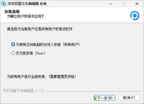 1、下载安装程序并打开,选择为所有用户安装,点击下一步