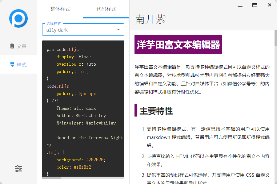 提供丰富的预设样式可供选择,并支持用户使用 CSS 自定义富文本的显示效果和导出样式。