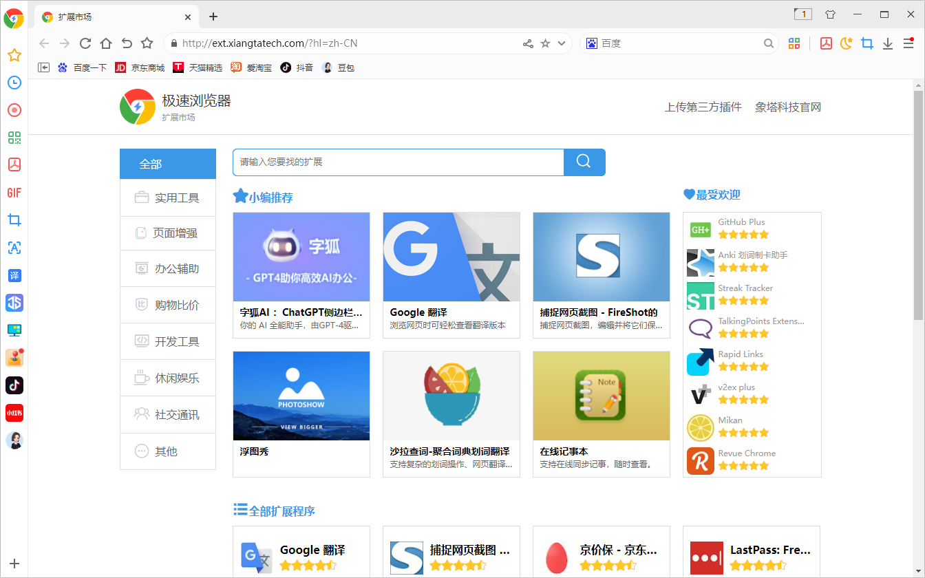 目前极速浏览器的插件市场还在开发中,如果用户想添加自己的插件,您可以打开系统设置中的"扩展程序”页面把crx插件包拖放到该界面,执行安装即可。