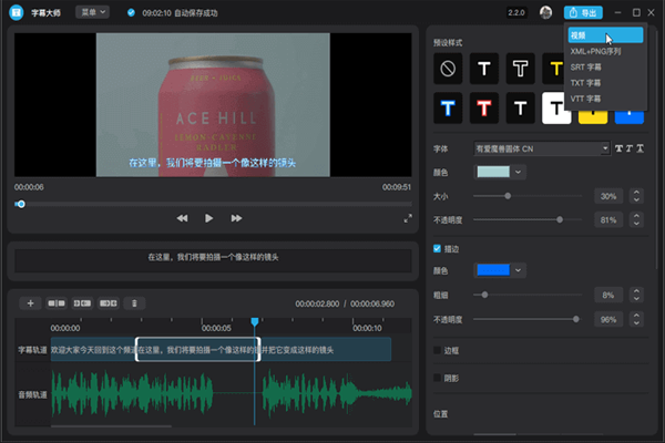 如果你想要更改字幕的字体、颜色、大小、透明度,甚至给字幕加边框、描边、阴影,或者更改字幕位置等,都可以在字幕大师内置的免费字幕编辑工具中直接修改。字幕大师还提供了丰富的字幕样式模板,只需要点击一下就可以轻松制作个性字幕,让你的视频字幕看起来更加炫酷。