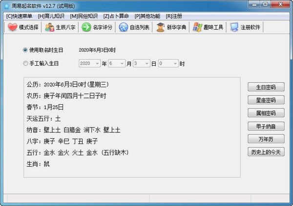 周易起名软件是一款用于起名的辅助软件,主要包含随机起名、汉字五行识别,汉字解析,姓名六十四卦评测,八字简易排盘,称骨算命功能。软件内置汉字库,识别汉字五行,可根据出生年月排出八字及十神,根据八字五行起名,并提供了专业六十四卦评测姓名方法。