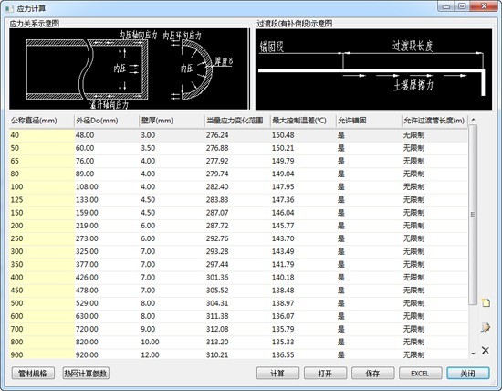 支持壁厚验算,管道应力计算,弯头应力计算,固定墩推力计算,伸长量计算,稳定性校核等目前直埋供热管道工程技术规程所要求的所有计算。 计算严格按照最新版规程《城镇供热直埋热水管道技术规程》(CJJ/T 81-2013)进行,计算精确,结果可靠