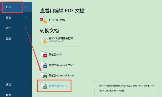 1、在“打开”选项卡下,选择“转换为其它格式”。