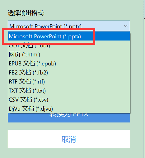 2、选择待转换的文档,进入格式设置窗口。将输出格式选择为pptx,这样就可以将PDF文档转换为PPT文件。
