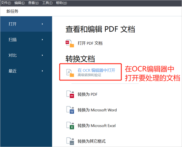 1、首先,先打开ABBYY FineReader PDF,在界面中选择“在ORC编辑器中打开”。