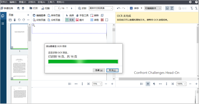 3、选定需要识别的页面之后,ORC编辑器就开始识别啦!只需稍等片刻,它便能自动将扫描件、PDF等文件识别出来。