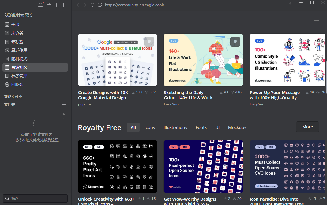 分享资源库:将整个资源库分享给同事或朋友时,他们可以通过导入Eagle后,直接使用你的文件分类和标签等设置。
