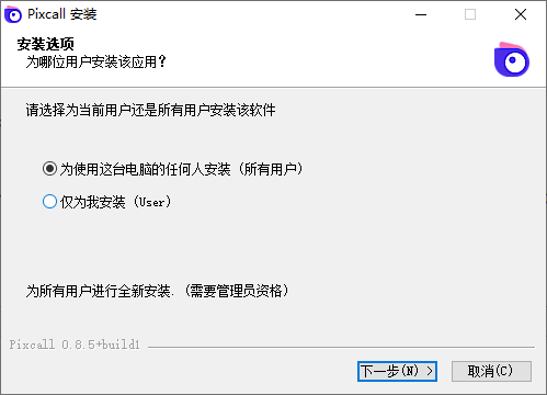 1、下载安装程序并打开,选择为所有用户安装,点击下一步