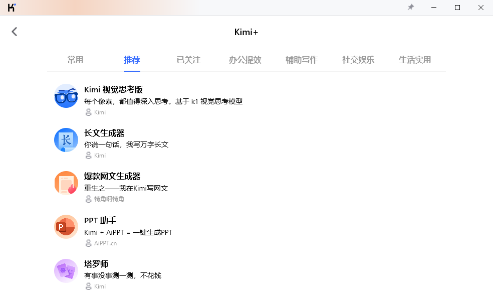 Kimi智能助手是一个十分好用的AI助手,让你随时随地都能使用它的强大功能,使用【Alt】+【空格】的组合键就能换出对话框进行提问和翻译,非常的方便。内置超多kimi+功能,如PPT助手、塔罗师、学术搜索、长文生成器等等,为办公、学习、娱乐带来全新的体验,感兴趣的小伙伴快来下载Kimi智能助手使用吧 。