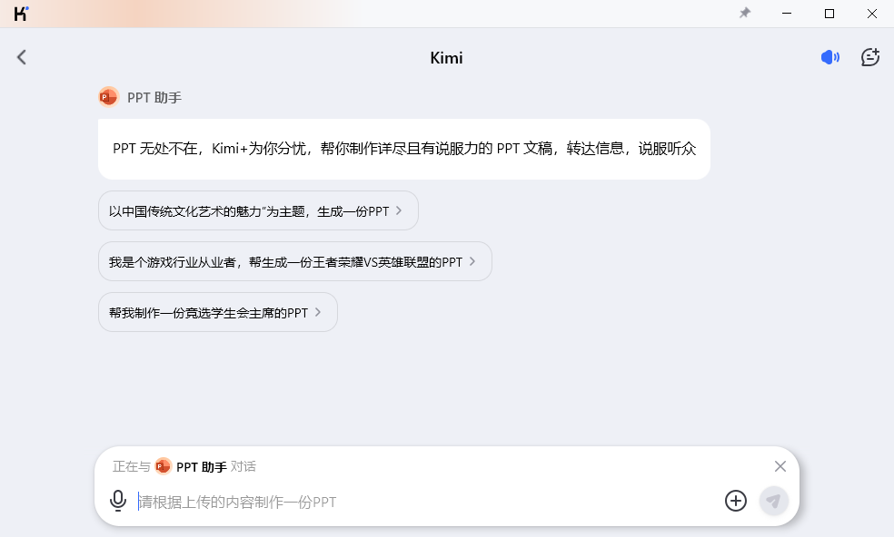 2、Kimi+也就是其它AI助手里的智能体,选择一个智能体进行使用,比如PPT助手,可以一键生成PPT