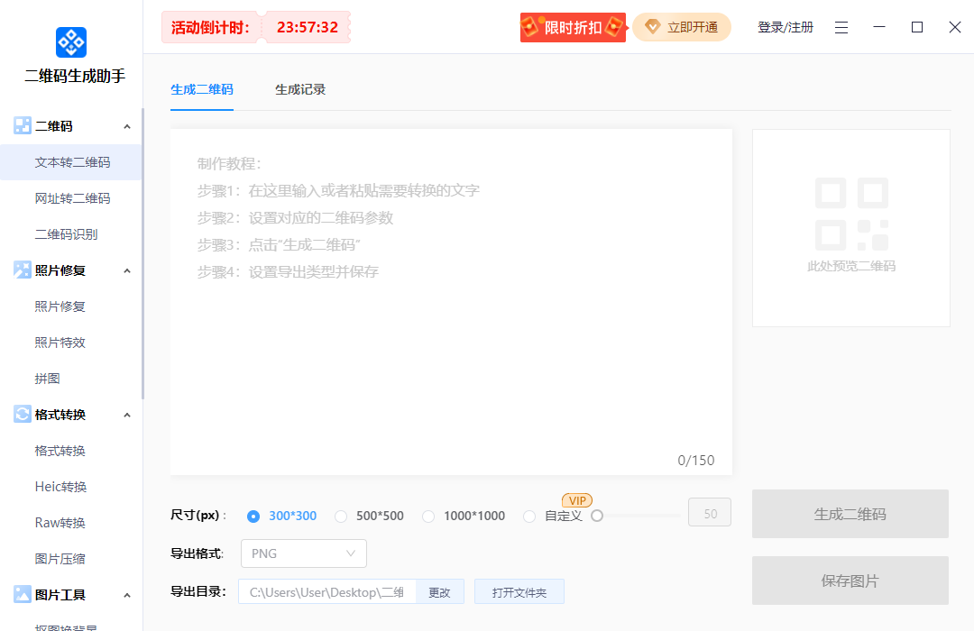 在文本框中输入文字后,设置二维码图片的尺寸、规格、导出目录,即可轻松生成一张二维码,还可查询生成记录,简单好用