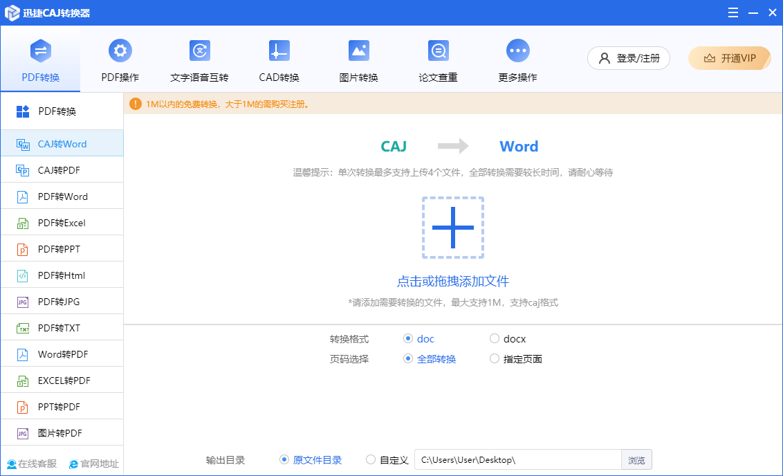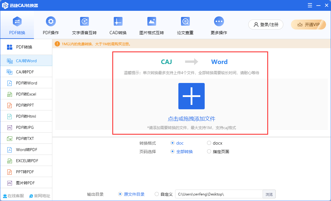 根据文档处理需求,选择对应的文档处理功能。例:CAJ转Word。