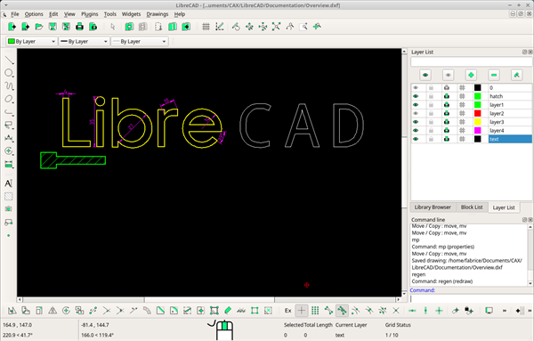 最初呈现的是一个带有主要工作区域和图层工具的窗口。在菜单栏中,你可以找到大部分的类别,包括尺寸、绘图、块和层。该软件允许用户自定义其界面,所以你可以自由地拖动任何你想带到工作区的元素。在不同的平台上操作也没有问题,因为 LibreCAD 的图形用户界面是建立在所谓的 Qt4 库上。因此,该软件可以在不同的平台上工作而不改变其性能和外观。