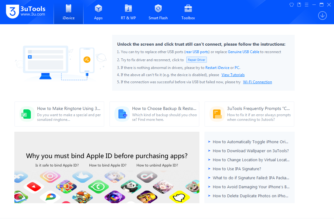 连接设备:使用USB数据线将iOS设备连接到电脑上,并打开3uTools。