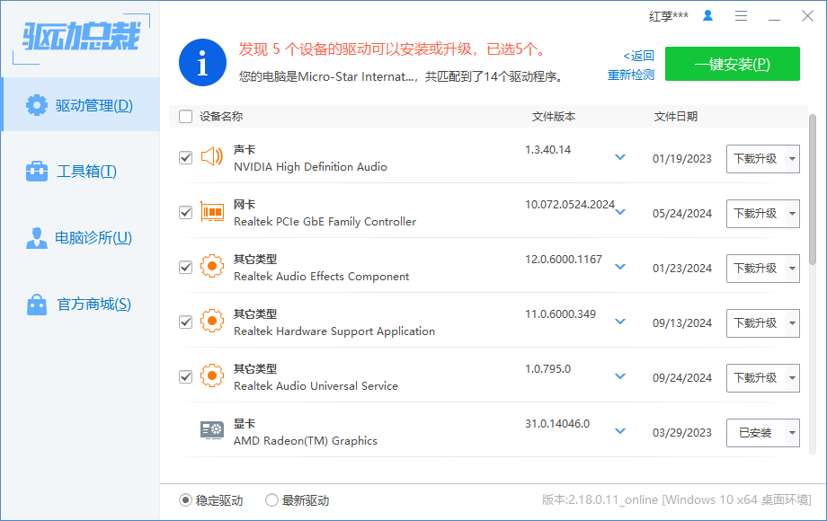2、检测完成后选择需要更新的驱动程序,点击一键安装